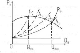 На рисунке 9.9 показано дросселирование на нагнетании, при этом характеристика машины остается неизменной, меняется характеристика сети (рабочие точки А1, А2, А3). Наибольшая подача соответствует точке А1, а наименьшая - границе помпажа (точке К).