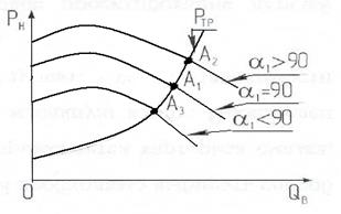 При дросселировании на всасывании (рисунок 9-10) происходит сдвиг режима с точки К влево вниз, что уменьшает ветвь неустойчивой части характеристики (А1, А2, А3- рабочие точки).