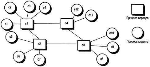 В системе между процессами и процессорами не обязательно должно соблюдаться отношение "один к одному". На рис. 9.3 показана физическая архитектура системы, которая состоит из шести клиентских машин и двух серверов. На них запускаются клиентские и серверные процессы, изображенные на рис. 9.2. В общем случае, говоря о клиентах и серверах, подразумевают скорее логические процессы, чем физические машины, на которых выполняются эти процессы.