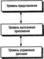 Архитектура системы клиент/сервер должна отражать логическую структуру разрабатываемого программного приложения. На рис. 9.4 предлагается еще один взгляд на программное приложение, структурированное в виде трех уровней. Уровень представления обеспечивает информацию для пользователей и взаимодействие с ними. Уровень выполнения приложения реализует логику работы приложения. На уровне управления данными выполняются все операции с базами данных. В централизованных системах между этими уровнями нет четкого разделения. Однако при проектировании распределенных систем необходимо разделять эти уровни, чтобы затем расположить каждый уровень на разных компьютерах.