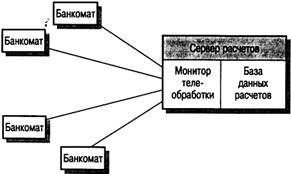 На рис. 9.6 показана сетевая система банкоматов. Заметим, что банкоматы связаны с базой данных расчетов не напрямую, а через монитор телеобработки. Этот монитор является промежуточным звеном, которое взаимодействует с удаленными клиентами и организует запросы клиентов в последовательность транзакций для работы с базой данных. Использование последовательных транзакций при возникновении сбоев позволяет системе восстановиться без потери данных.