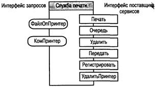 В качестве примера рассмотрим компонент (рис. 12.3), который предоставляет сервисы вывода документов на печать. В нашем примере поддерживаются следующие сервисы: печать документов, просмотр состояния очереди на конкретном принтере, регистрация и удаление принтеров из системы, передача документа с одного принтера на другой и удаление документа из очереди на печать. Очень важно, чтобы компьютерная платформа, на которой исполняется компонент, предоставляла сервис (назовем его ФайлОпПринтер), позволяющий извлечь файл описания принтера, и сервис КомПринтер, передающий команды на конкретный принтер.