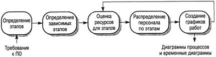 График работ по проекту обычно представляется в виде набора диаграмм и графиков, показывающих разбиение проектных работ на этапы, зависимости между этапами и распределение разработчиков по этапам. Эти диаграммы рассматриваются в следующем разделе. В настоящее время существует много различных программных средств поддержки управления проектами, например Microsoft Project.