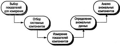 Процесс измерения показателей ПО, который может быть частью контроля качества, показан на рис. 25.7. Каждый компонент системы анализируется отдельно, значения одинаковых показателей сравниваются между собой, а иногда и с аналогичными статистическими данными других проектов. Аномальные данные измерений по какому-либо системному компоненту должны стать поводом для проведения мероприятий по обеспечению качества этого компонента.