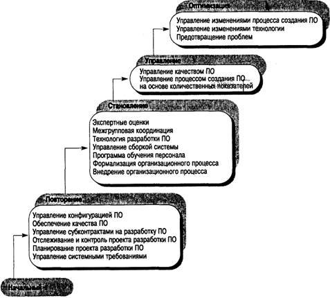 1. Начальный уровень. На этом уровне компания не имеет установленных процедур управления персоналом и планирования проектов. Даже если формальные процедуры для контроля над проектами и существуют, нет действующих механизмов проверки правильности использования этих процедур. Такая компания может успешно заниматься разработкой ПО, однако качество конечного продукта, а также ход выполнения проекта (соблюдение бюджета и графика работ) предсказать трудно.