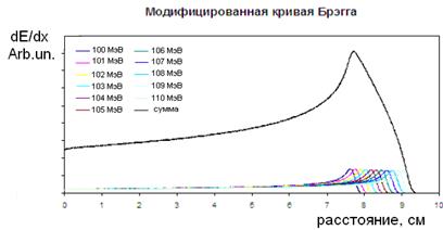 Рис. Кривые Брэгга для протонов в диапазоне энергий от 100 до 110 МэВ и модифицированная кривая Брэгга.