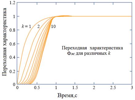 для различных значений k и расположение корней нормированного многочлена Бесселя, соответствующих времени переходного процесса в 1с., представлены на рис. ниже.