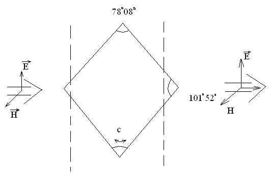 В сечении чертежа, естественно, получается ромб с острым и тупым углом. Линия, проходящая через вершины тупых углов, называется оптической осью кристалла С.