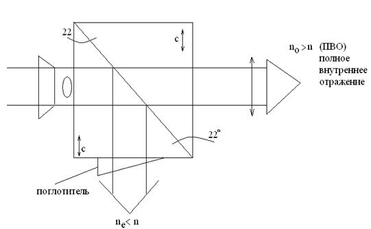 Схема поляризатора включает две призмы, выполнены из одноосного кристалла. Направление из исландского шпата, в виде двух треугольных призм, склепных канадским бальзамом, имеющим n=1,55.