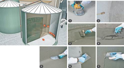 Рис. 8. Защита конструкций установок биогаза: 1 – предварительная подготовка основания; 2 – грунтование; 3 – адгезионный мост; 4 – выравнивание и выкружка; 5 – формирование выкружки; 6 – первый защитный гидроизоляционный слой; 7 – второй защитный гидроизоляционный слой