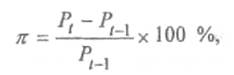 Темп инфляциирассчитывается как процентное отношение разницы общего уровня цен текущего года Рt и общего уровня цен предыдущего года Рt-1 к уровню цен предыдущего года: