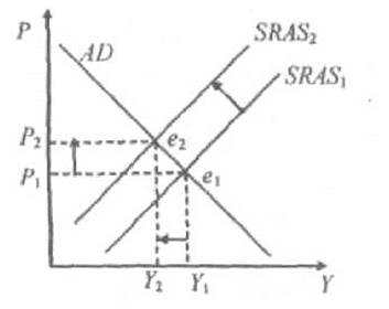 Инфляция издержек. Состояние экономики, которое характеризуется одновременным увеличением цен и падением объема выпуска, называется стагфляцией. Очевидной причиной стагфляции служит уменьшение совокупного предложения, то есть инфляция издержек производства (рис. 31).