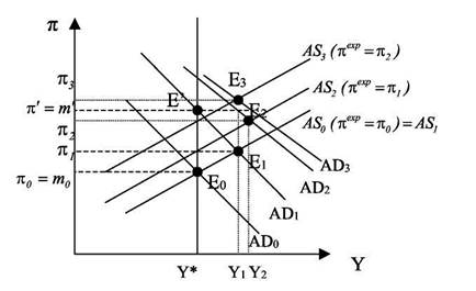 В результате кривая совокупного спроса сдвинется вверх таким образом, что при прежнем уровне выпуска Y* темп инфляции будет равен возросшему темпу роста денежной массы: π′ = m′. При этом в силу адаптивных ожиданий кривая совокупного предложения останется на месте. В результате краткосрочное равновесие будет иметь место в точке Е1 Заметим, что в первом периоде после изменения темпа роста денежной массы инфляция растет, но остается меньше нового темпа роста денежной массы π0 < π1 < m′.