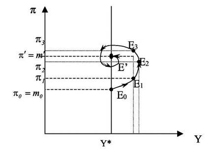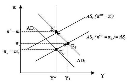 Процесс приспособления будет продолжаться, пока экономика не придет к новому долгосрочному равновесию в точку Е', где выпуск соответствует уровню полной занятости, а темп инфляции равен темпу роста денежной массы m′.