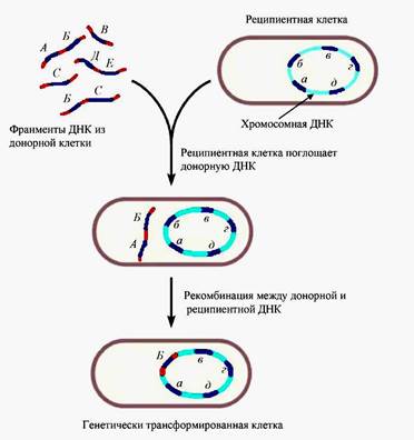 · Трансформация– перенос генетической информации, при котором ДНК, выделенная из клетки-донора, поступает в клетку-реципиент.