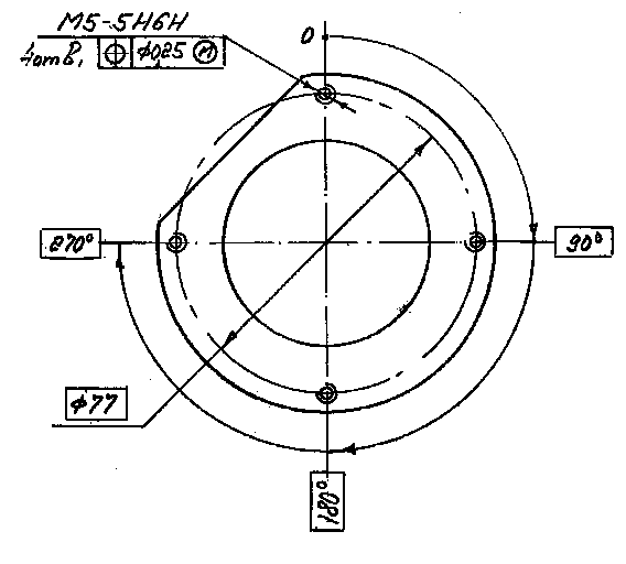 При соединениях типа щит-корпус, которые имеют посадочные поверхности, иногда бывает целесообразно задавать базу при выполнении отверстий под “крепеж” по посадочной поверхности с зависимым допуском. Это иногда дает возможность расширить позиционный допуск на положение всей группы отверстий под “крепеж” относительно осей базовой поверхности.