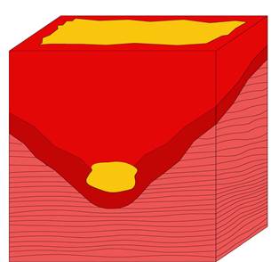 Рис.21.1. Схема образования прорыва в кристаллизаторе слябовой МНЛЗ: по грани (слева) и по углу (справа)