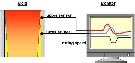 Работа системы предотвращения прорывов базируется на сравнении показателей величины разности температур от двух термопар, расположенных одна над другой. При этом температура поверхности заготовки в области разрыва корочки несколько выше, чем в прилегающих зонах, что провоцирует возникновение трещин в твердой корочке. В случае обнаружения прорыва корочки на некоторое время снижается скорость вытяжки заготовки, что позволяет залечить место прорыва.
