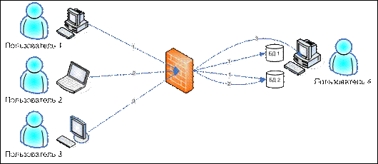 Существуют кроме программ-антивирусов еще межсетевые экраны (firewall, брандмауэр) – это программы, которые контролируют доступ внешних пользователей к компьютеру, программам и данным, разграничивая определенные права доступа. Пример использования межсетевого экрана показан на следующем рисунке:
