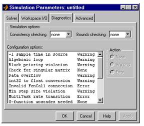 Сообщения об ошибках или проблемных ситуациях, обнаруженных Simulink в ходе моделирования и требующих вмешательства разработчика выводятся в командном окне MATLAB. Исходный перечень таких ситуаций и вид реакции на них приведен в списке на вкладке Diagnostics. Разработчик может указать вид реакции на каждое из них, используя группу переключателей в поле Action (они становятся доступны, если в списке выбрано одно из событий):