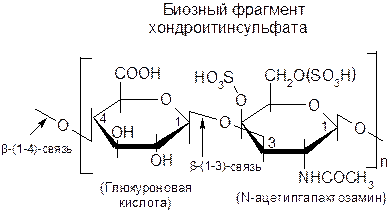 Хондроитин-сульфат – гетерополисахарид, построенный из сульфатированных остатков хондрозина – дисахарида, состоящего из остатков глюкуроновой кислоты и N-ацетилгалактозамина, соединенных β-(1→3)-гликозидными связями. Биозные фрагменты соединяются β-(1→4)-гликозидными связями.