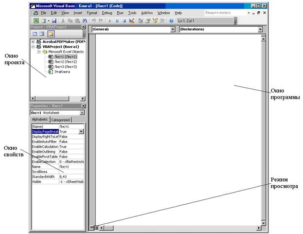 Редактор VBA состоит из следующих окон: