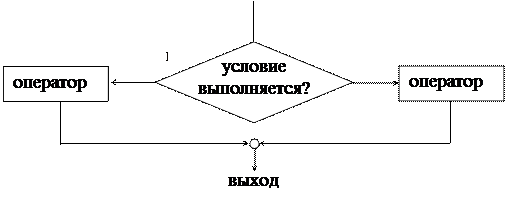 Базовая структура разветвление (называемая также ЕСЛИ-ТО-ИНАЧЕ) обеспечивает в зависимости от результата проверки условия (истина или ложь) выбор одного из альтернативных путей работы алгоритма. Каждый из путей ведет к общему выходу (продолжению алгоритма). Работа алгоритма продолжается независимо от того, какой путь будет выбран. Возможные пути выполнения алгоритма помечаются на схемах алгоритмов соответствующими метками: "да"/"нет" (или "1"/"0"). Алгоритм, в состав которого входит базовая структура разветвление, называется разветвляющимся алгоритмом, а реализуемый им вычислительный процесс – разветвляющимся вычислительным процессом.