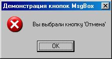 Аргумент Buttonsдля MsgBoxпозволяет задавать количество и тип кнопок, а также наличие или отсутствие в окне сообщения одного из значков Windows для обозначения предупредительного сообщения, сообщения запроса, информационного сообщения и критического предупредительного сообщения.Можно также использовать аргумент Buttonsдля определения того, какая из отображаемых кнопок (кнопка 1, 2, 3 или 4) является кнопкой по умолчанию в окне сообщения. Каждый раз можно задавать только один тип кнопки, один значок и одну кнопку по умолчанию.