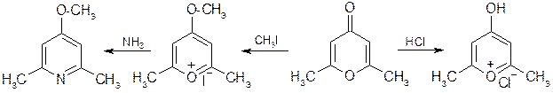 Характерным химическим свойством γ-пирона является его сравнительно высокая основность, которая связана с тем, что образующийся катион имеет строение пирилиевой соли: