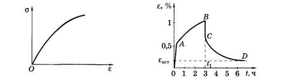 Примерный вид кривых ползучести компактной костной ткани приведен на рис. б). Участок 0А соответствует быстрой деформации, АВ — ползучести. В момент tv соответствующий точке В, нагрузка была снята. ВС соответствует быстрой деформации сокращения, CD — обратной ползучести. В результате даже за длительный период образец кости не восстанавливает своих прежних размеров, сохраняется некоторая остаточная деформация eост.