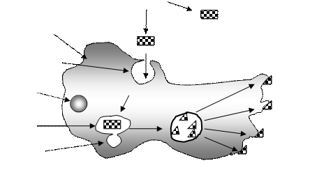 Образующиеся в процессе эндоцитоза (фагоцитоз и пиноцитоз) эндоцитозные пузырьки – пиноцитозные пузырьки (рис. 12. (1,1а) и фагосомы (рис. 12. (2,2а)) – также сливаются с лизосомой, формируя фаголизосому. Их внутреннее содержимое – микроорганизмы, органические вещества и т.д. расщепляются ферментами лизосом до элементар-