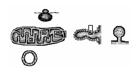 В грибовидных тельцах происходит синтез АТФ. В самой толще внутренней мембраны митохондрий располагаются ферментные комплексы, переносящие электроны с НАДН2 на кислород. Эти комплексы называютсядыхательной цепью или цепью пере-