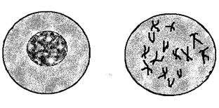 Рис. 20. Два состояния наследственного материала в клетках в клеточном цикле: А – в интерфазе наследственный материал расположен в хромосомах, которые частично деконденсированы и расположены в ядре; Б – при делении клетки наследственный материал выходит из ядра, хромосомы располагаются в цитоплазме.