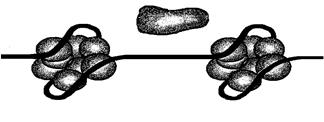 Субмолекулярное строение хроматина (в дальнейшем мы будем их называть интерфазные хромосомы) и хромосом делящейся клетки (в дальнейшем мы будем их называть метафазные хромосомы) до настоящего времени полностью не выяснено. Однако ясно, что при различных состояниях клетки (интерфаза и деление) организация наследственного материала различна. В основе интерфазных (ИХ) и метафазных хромосом (МХ) лежит нуклеосома. Нуклеосома состоит из центральной белковой части, вокруг которой обёрнута нить ДНК. Центральную часть образуют восемь молекул белка-гистона – Н2А, Н2В, Н3, Н4 (каждый гистон представлен двумя молекулами). В связи с этим сердцевина нуклеосомы носит название тетрамер, октамериликор. Молекула ДНК в форме спирали обвивает кор 1,75 раз и переходит на соседний кор, обвивает его и переходит на следующую. Таким образом создаётся своеобразная фигура, напоминающая нитку (ДНК) с нанизанными на ней бусами (нуклеосомами).
