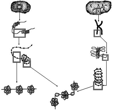Рис. 22. Модель упаковки хромосомы в клетках, находящихся в интерфазе и митозе.