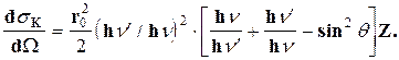 Здесь приведена вероятность комптоновского рассеяния в направлении q в единице телесного угла на Z электронах (т.е. на атоме с зарядом Z); r0 = е2/ (mc2) — классический радиус электрона. При энергиях квантов очень малых (hn < mc2) энергии рассеянных квантов равны энергиям падающих [см. (2.4)],а сечение