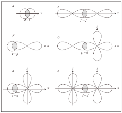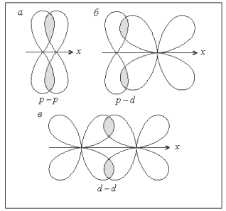 При участии в образовании связи р-орбитали (рис. 5, б, г, д) и d-орбитали (рис. 5, в, д, е) перекрывание по σ-типу осуществляется в направлении наибольшей плотности электронных облаков, которое и является наиболее энергетически выгодным. Поэтому при образовании связи такой способ всегда реализуется в первую очередь. Следовательно, если связь одинарная, то это обязательно σ-связь, если кратная, то одна из связей непременно σ-связь.