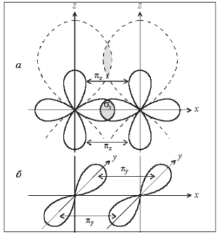 Схема перекрывания электронных облаков приведена на рис. 7. Одна из связей (2рх–2рх) образована по σ-типу. Две другие (2рz–2рz, 2рy–2рy) – по π-типу. Для того чтобы не загромождать рисунок, изображение перекрывания 2рy-облаков вынесено отдельно (рис. 7, б). Для получения общей картины рис. 7, а и 7, б следует совместить.