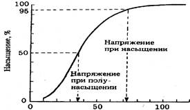 Схема поясняет, что при напряжении 02 73 мм.рт.ст. 95% гемоглобина насыщаются кислородом. Напряжение полунасыщения - напряжение, при котором насыщено 02 50% пигмента.