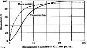 Миоглобин находится в мышцах животных, особенно в скелетных мышцах млекопитающих. Процент насыщения миоглобина кислородом происходит при более низких цифрах парциального давления кислорода. На графике видно, что при снижении парциального давления кислорода процент насыщения оксигемоглобина кислородом в сравнении с миоглобином меньше. Миоглобин остается насыщенным 02 на 80% до тех пор, пока парциальное давление кислорода не падает ниже 20 мм.рт.ст. (гемоглобин – на 40% !) Это означает, что миоглобин удерживает кислород в покоящемся мышечном волокне, но отдает его, когда в результате интенсивной мышечной работы используется весь кислород, доставленный гемоглобином. Т.е. миоглобин является резервуаром кислорода в мышцах.