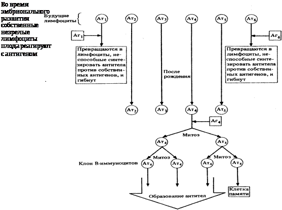 Предполагается, что если в период внутриутробной жизни незрелый лимфоцит встречает соответствующий ему антиген, то он погибает. Благодаря этому у животного не синтезируются антитела к собственным макромолекулам, и оно становится толерантным к собственным антигенам.