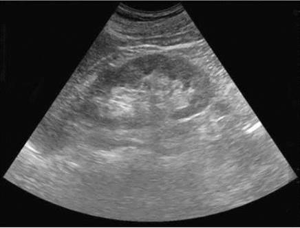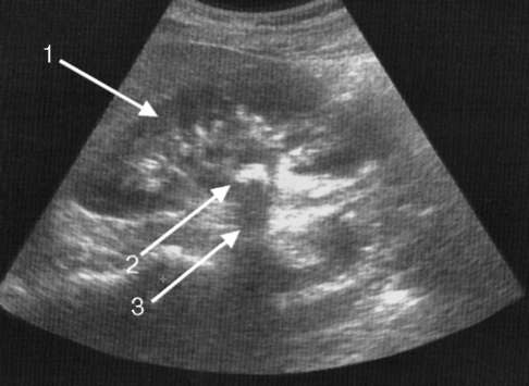 Полипозиционное сканирование с последовательным перемещением плоскости сканирования позволяет получить информацию обо всех отделах органа, в котором дифференцируются паренхима и центрально расположенный эхокомплекс. Кортикальньгй слой имеет равномерную, несколько повышенную по сравнению с мозговым веществом эхогенность. Мозговое вещество, или пирамиды, на анатомическом препарате почки имеют вид треугольных структур, обращенных основанием к контуру почки и вершиной к полостной системе. В норме видимая при УЗИ часть пирамиды составляет около трети от толщины паренхимы.