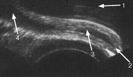 Рис. 4.18. Трансректальная сонограмма пузырно-мочеточникового сегмента в норме: 1 - мочевой пузырь; 2 - устье мочеточника; 3 - интрамуральный отдел мочеточника; 4 - юкставезикальный отдел мочеточника