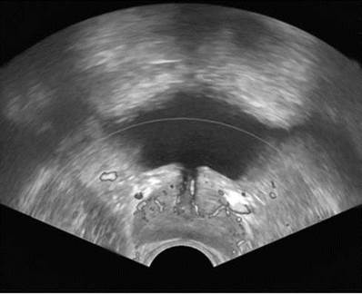 УЗИ мочеиспускательного канала. Мужская уретра представлена протяженной структурой от шейки мочевого пузыря в направлении верхушки и имеет неоднородную структуру низкой эхоплотности. Место впадения семявыбрасывающего протока в простатическую уретру соответствует проекции семенного бугорка. За пределами простаты уретра продолжается в направлении мочеполовой диафрагмы в виде вогнутой по большому радиусу дуги. В проксимальных отделах, в непосредственной близости от верхушки простаты, уретра имеет утолщение, соответствующее рабдосфинктеру. Ближе к мочеполовой диафрагме кзади от уретры определяются парные периуретральные (куперовы) железы, имеющие вид симметричных округлых гипоэхогенных образований диаметром до 5 мм.