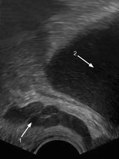 Рис. 4.22. Трансректальная сонограмма: семенные пузырьки (1) и мочевой пузырь (2) в норме