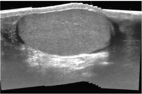 УЗИ органов мошонки. При УЗИ органов мошонки используют датчики высокой разрешающей способности, от 5 до 12 мГц, что позволяет хорошо видеть мелкие структуры и образования. В норме яичко определяется в виде гиперэхогенного образования овальной формы с четкими, ровными контурами (рис. 4.23).