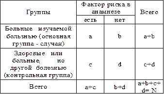 Так же как и в когортных исследованиях, для оценки результатов исследования случай- контроль можно применить таблицу «два на два».
