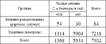Таблица 8. .Встречаемость частых ангин в анамнезе больных ревматоидным артритом и в анамнезе здоровых лиц. Источник. Эпидемиология ревматических болезней. Л.И. Беневоленская, М.М. Бржезовский. Москва «Медицина»,1988. (с небольшими изменениями).