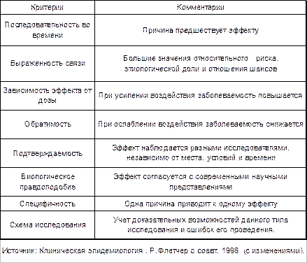 К сожалению, нет абсолютно надежных критериев, на основании которых можно было бы делать окончательное заключение о наличии причинно-следственной связи фактора риска и болезни. Только совокупность доказательств по различным критериям позволяет с достаточной долей достоверности делать соответствующие выводы.
