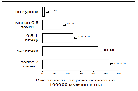 Зависимость эффекта от дозы(зависимость доза-эффект) Такая зависимость может быть выявлена, если частота заболеваний (смертей и других эффектов) находится в корреляционной связи с изменениями силы воздействия. Ярким примером является хорошо изученный факт увеличения риска смерти от рака легкого от числа выкуренных сигарет (рис. 9)